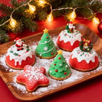 3D风与重拟物结合,面包片拼贴成圣诞树,点缀糖果与金星,喜庆甜蜜中透出趣味感,节日氛围浓厚。