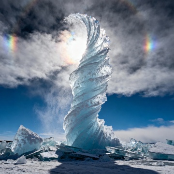 超写实摄影风格,清澈透明的冰块从蓝色水面中溅起,水花与冰晶在阳光下折射出耀眼光芒,背景是平静的湖面和远处朦胧的山脉,整体色调以纯净的蓝白为主,光线明亮柔和,营造出清冷、通透、宁静而富有生命力的氛围,冰块形态棱角分明,表面光滑带有自然纹理,水珠在冰面和水面上晶莹剔透,画面层次分明,近景冰块细节清晰,远景山峦虚化,展现出冰与水交融的动态瞬间。