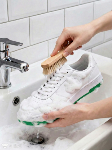 后面的背景是宿舍洗漱台大场景,背景模糊一点点,一个男学生蹲在水盆旁边,水盆放在地面上,帆布鞋在水盆里面浸泡着,鞋面二分之一在水里,二分之一在水面,水面上的鞋子上有污渍,产品放在旁边,青春校园风,强调高效去污,1:1画面,画面干净明亮
