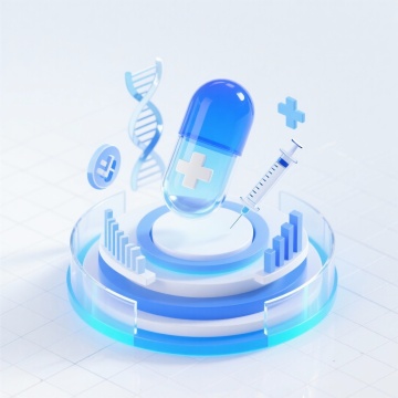 未来感医疗主题3D插画,融合科技蓝调与清透玻璃材质,轻拟物风格呈现药丸、DNA与注射器,象征精准医疗与健康科技。