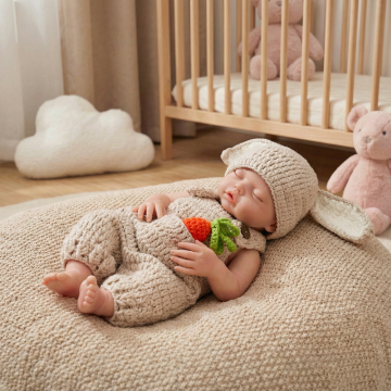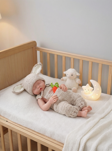 方案一:摇篮俯拍场景:娃娃穿青蛙套装躺于白色毛绒摇篮,四周散落粉色安抚玩具,暖光聚焦主体,突出产品细节