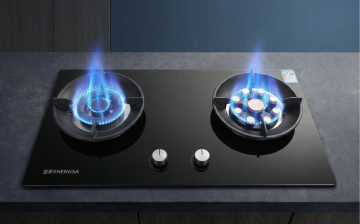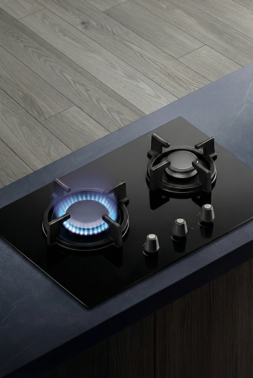 工业风户外灶具,金属质感搭配橙色点缀,科技感火焰显示与光影交织,展现现代机能美学与质朴野营场景的融合。