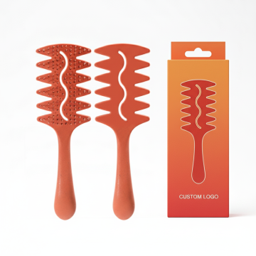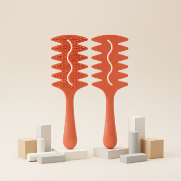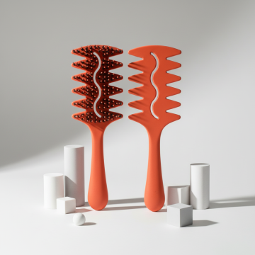 给图中的洗头梳子做一个材质细节介绍的主图,用指引展示的效果,梳齿是黑色尼龙细长梳齿,梳齿的珠头是环氧树脂与梳子同一个颜色,添加图标加深表达功能效果,纯色背景