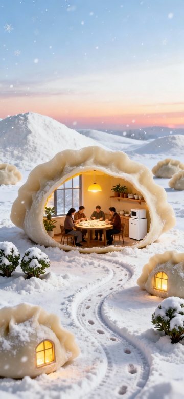 冬至主题的创意温馨插画,充满节气氛围与巧思: 核心主题:以 “冬至” 为核心,搭配 “暖炉已备” 的文字,点明冬日节气的温暖基调; 创意造型:将房屋设计成巨型饺子形态,既呼应冬至吃饺子的传统习俗,又让画面充满趣味辨识度; 室内场景:饺子形小屋内,一家人围坐圆桌聚餐,桌上摆满饺子等食物,暖光吊灯、置物架等布置,尽显阖家团圆的温馨; 外部环境:窗外是飘雪的冬日雪景(覆雪山林、落雪树木),室内暖融融的团聚与室外冷寂雪景形成对比,更凸显冬至的暖意。