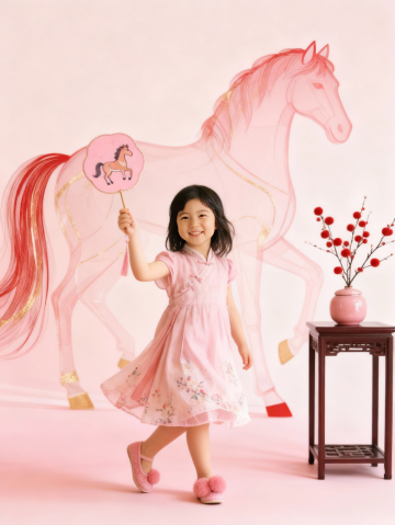 粉色系中式童趣插画风,融合双重曝光与水彩质感,刺绣元素点缀裙摆,梦幻马影环绕,传递甜美可爱与节日喜庆。