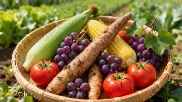 两根刚从湿润泥土中拔出的新鲜胡萝卜,表皮覆盖着湿润的黑色泥土和细密根须,橙红色的肉质根带着自然生长的细微弯曲,顶部翠绿的羽状复叶舒展挺拔,叶片上还挂着晶莹的水珠,背景是模糊的深绿色植物形成的自然阴影,整体呈现出高清晰的写实摄影风格,温暖的自然光从斜上方照射,突出胡萝卜的质感和泥土的颗粒感,营造出新鲜、有机、充满生命力的田园氛围,画面中胡萝卜的摆放角度略微调整,泥土的分布细节和根须的形态与原图有所不同。
