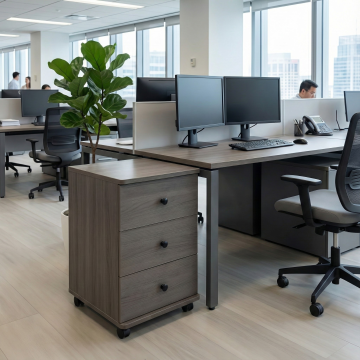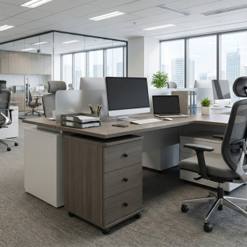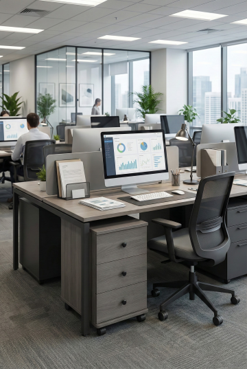高写实3D渲染风格的现代办公室内部场景,采用明亮通透的采光设计,大面积落地窗引入自然光,窗外可见城市高楼与秋季树木景观。室内以浅灰色、白色和原木色为主色调,搭配深灰色地面,形成简洁专业的色彩和谐。天花板悬挂整齐排列的长方形LED平板灯,与自然光共同营造柔和均匀的光影效果,地面投射出清晰的窗格阴影。开放式办公布局,配备浅色实木办公桌、黑色办公椅、白色文件柜和黑色电脑显示器,书架上整齐摆放书籍和文件夹,窗台及办公桌角落点缀绿色植物增添生机。空间线条简洁流畅,展现出现代、简约、高效的办公氛围,可从不同角度(如靠窗视角、办公室中央视角、走廊视角等)展示,环境可替换为不同城市景观(如商业区、公园旁、海滨等)的办公室背景。