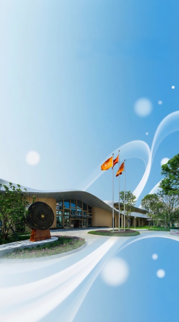 中景仰拍视角,现代风格校园建筑群沐浴在清晨金色阳光中,主体为红砖钟楼式教学楼主楼与红砖连廊式教学楼组合,左侧配银灰色金属质感实验楼,白色校门位于中央广场,门前有几何形绿化带、成排梧桐树及石板道路,天空湛蓝点缀絮状白云,阳光透过树叶形成斑驳光影,地面有黄色校车、骑行学生及步行师生,钟楼顶部时钟指向8:00,教学楼玻璃幕墙反射着天空与树木,建筑细节包括红砖砌法纹理、金属窗框线条和浮雕校徽,色彩以砖红色与灰白色为主调,点缀绿色植物,构图采用三分法,前景有晨读学生剪影,中景建筑群形成明确透视,背景是城市天际线,整体呈现明快而庄重的学术氛围,写实主义风格,空间纵深感强烈。