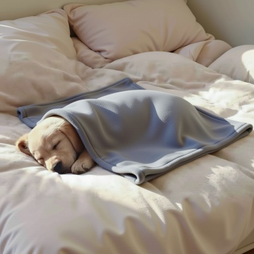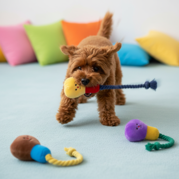 方案一:萌趣互动款-温馨午后:泰迪前爪抱黄色玩具翻滚,棕色款半埋浅蓝地毯,蓝色绳结垂落,阳光光斑洒在彩色靠垫上
