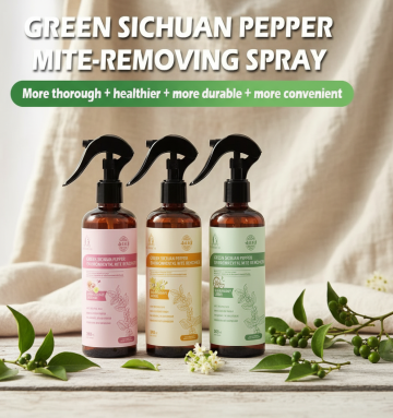 成功保留四瓶除螨喷雾及所有字体内容,并将背景替换为原木色桌面,桌面上散落着新鲜的青花椒枝、绿叶和白色小花,背景为浅米色亚麻布,光线从左侧窗户斜射形成柔和光斑,整体风格自然清新,突出了产品的天然属性。