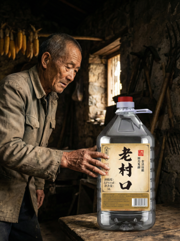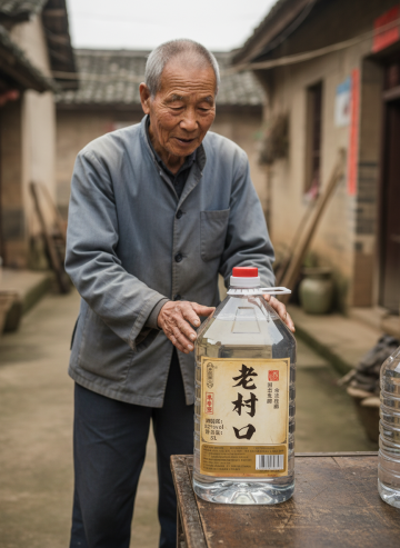 这是一大桶白酒,做一张场景图,酒桶在中间构图不变,周围一个农村老人伸手抚摸着这桶酒