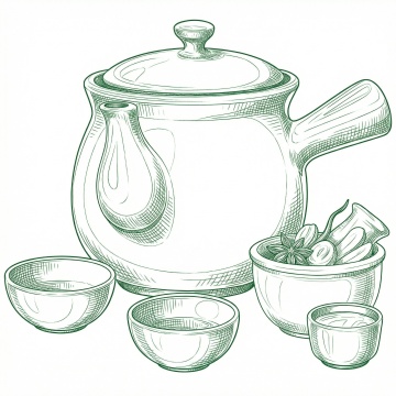 一系列6个中国传统茶具主题的插画,保持原有的水墨手绘风格,粗重有力的黑色轮廓线条,内部填充以不同的纯色,背景为单一纯色。每个插画中的茶具元素完全不同,包括茶壶、茶杯、茶盘、茶叶罐、公道杯、盖碗等,元素类目保持茶具相关。所有插画规整地排布在一起,形成一个统一的系列素材集合。