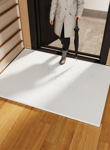现代极简风格的客厅场景,以浅灰色调为主的现代家具布置,画面聚焦于铺在浅灰色瓷砖地面上的浅灰色条纹地毯特写,地毯表面有细腻的竖条纹纹理和柔软的编织质感,占据画面下方大部分区域;背景中可见浅灰色布艺沙发,搭配几个同色系的靠垫,沙发旁有一个圆形金属边框的小茶几,靠墙处有一个简约的灰色搁板,上面放置一个小型装饰画框;右侧是大面积的落地窗,透过轻薄的白色纱帘洒入明亮柔和的自然光,光线在地毯和地面上形成自然的光影过渡,窗外可见模糊的绿色植物,整体营造出宁静、整洁、高级的现代家居氛围,空间感开阔,线条简洁,色彩统一和谐,具有清晰的视觉层次和舒适的居住感。