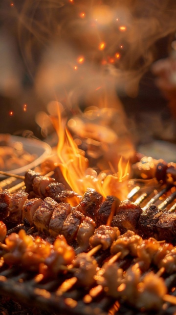 浓郁色彩的油画风格描绘热闹的烧烤夜市场景,前景是炭火上滋滋作响的烤肉串,肉质鲜嫩多汁,表面撒有香料,火焰跳跃舔舐着肉串,升腾的烟雾带着金色光晕,周围摆放着装有不同酱料和配菜的小碗,背景是虚化的暖黄色灯光和人影,整体画面充满烟火气与温暖氛围,笔触厚重富有质感,光影对比强烈,色彩饱和度高,强调食物的诱人光泽与夜市的热闹氛围。