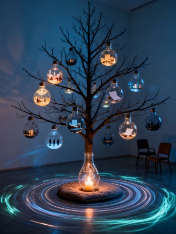 梦幻感与科技感交织,玻璃风灯泡悬挂于枯枝树上,内藏微缩场景,光影流动如涟漪,营造静谧唯美的虚拟自然艺术装置。