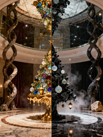 双色圣诞树融合鎏金与墨黑,重拟物风展现奢华质感,光影交错中营造梦幻体积感,虚拟自然元素与金属风交织,呈现极致节日艺术。