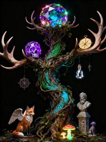 梦幻感与科技感交织,玻璃风灯泡悬挂于枯枝树上,内藏微缩场景,光影流动如涟漪,营造静谧唯美的虚拟自然艺术装置。