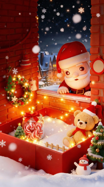 C4D渲染,皮克斯风格圣诞海报,卡通,在一片雪地上,第一人称特写俯视角度,地上放着一个很大的黄色倒角圆滑的五角星礼盒,圆润的五角星形状,盒身缠绕着一圈发光灯串,礼盒内部装满物品:圣诞老人玩偶、彩色糖果、麋鹿玩偶、多个小礼物盒子,还有一张小卡片,卡片上有手写的“merry Christmas”文字,礼盒周围散落着彩色丝带,黄色光晕营造温馨氛围,画面边缘有自然暗角,雪地背景中点缀着雪堆、戴着红色围巾的雪人、装饰着彩灯和星星的圣诞树,整体色调温暖明快,细节丰富,充满节日气息