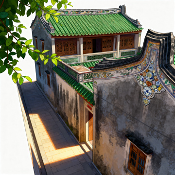 中式古典插画风,清新雅致的庭院景观,石径通幽,绿树成荫。