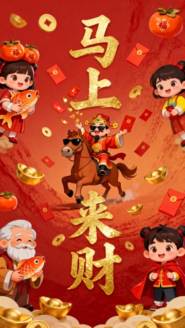 国潮风卡通形象搭配鎏金大字“马上来财”,剪纸风格元素点缀,喜庆红底烘托节日氛围,寓意新春招财纳福。