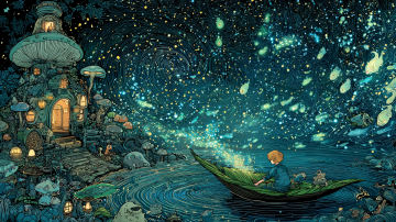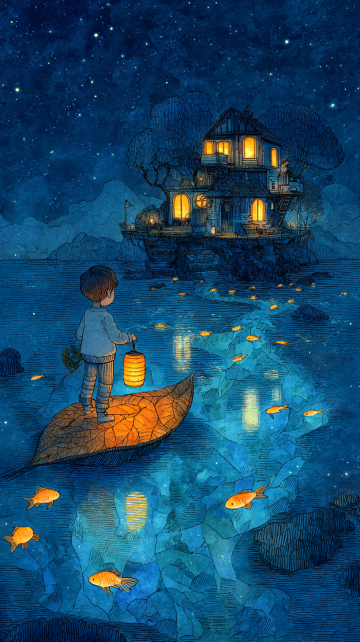 Wide-angle, low perspective shot of a magical night journey. From behind, we see a small child in rumpled pajamas standing bravely on a leaf-boat, guided by a swirling river of golden light emitted from thousands of tiny, glowing fish beneath the water's surface. His lantern-goldfish is a bright focal point. The incredible destination: a huge, intricate treehouse floating among misty clouds and slow-moving whales in the starry sky, connected by a rope bridge. Art style: a mix of the fantasy of Studio Ghibli and the painterly light of James Gurney. Cinematic, awe-inspiring, yet deeply cozy.