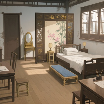 【冬季】远景镜头,雾白色的水彩幻化成朦胧的纱幕笼罩画面,苍青与墨绿的松针、柏叶坚韧挺立,其间点缀着殷红的山茶与雪白色的蜡梅,冰晶凝结在枝干上折射寒光,月光透过薄雾形成淡蓝光斑,色调以雾白为底,映衬松柏青与山茶红,营造冬日纯净而坚韧的童话意境。