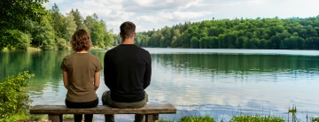 我提供的一张一对欧美情侣坐在靠椅的图,女生坐的是基础款的尺寸,男生坐的是加大款的尺寸,现在需要把他们放置在户外湖边上的木质长条椅上,要求融合自然,画面通透,画面尺寸保持不变,最最最最重要的就是不能改变我提供的素材,保持素材的一致性