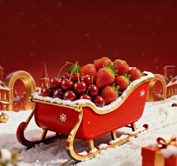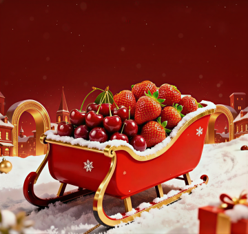 梦幻感与喜庆感交织,3D风与插画风融合,圣诞老人驾着鎏金雪橇飞越灯火璀璨的小镇,粒子光效洒落,营造温馨卡通氛围,尽显节日浪漫。
