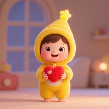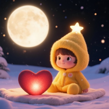 夜晚,潮玩IP星星人坐在黑夜里,穿着一身黄色连体毛绒外衣,连体衣的帽子是三角桶状的,帽子最上面的角有个发光的星星,手里捧着一个闪闪发光的星星,周围一篇漆黑,天空亮着很多星星,光照在小黄人的脸上,星星人很幸福的看着手里的星星