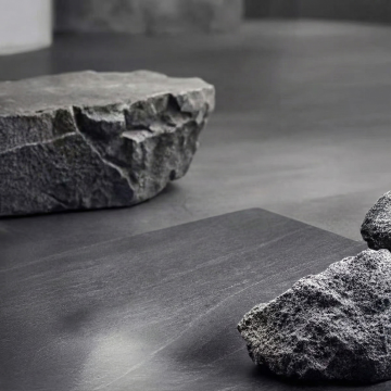 极简主义摄影风格,深色背景展台设计,展台主体为一块悬浮于平静水面的不规则深色岩石展台,岩石表面呈现自然的粗糙质感与细微纹理,展台在水面形成清晰对称的倒影,水面泛着柔和的蓝色光泽并带有轻微涟漪,背景是渐变的深灰色天空与朦胧的远山轮廓,整体色调以深灰、蓝灰为主,营造出宁静、沉稳、高级的氛围,光线柔和均匀,突出展台的立体感与材质感,画面构图简洁,留白充足,视觉焦点集中于中央的岩石展台,体现出自然、简约而富有力量感的设计美学。