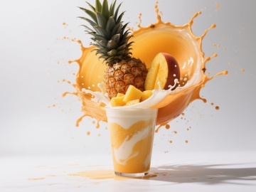 黄色饮品杯左边增加一个切开的橙子和梨,绿色新品杯旁边右边增加一个切开 的牛油果和切小块的梨