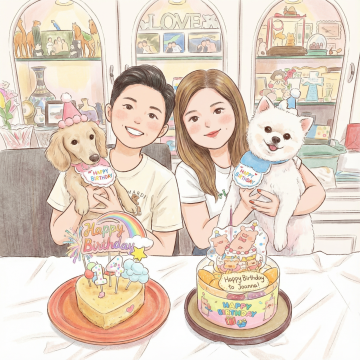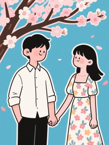 插画风情侣在湖畔相望,手捧鲜花,梦幻浪漫,清新氛围,灯光点缀,尽显温馨。