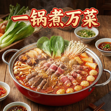 重拟物风呈现热辣沸腾的中式火锅,油光溢彩,蒸汽缭绕,辣椒与牛肚在光影中跃动,质朴木桌衬托实景感,如油画般浓郁。