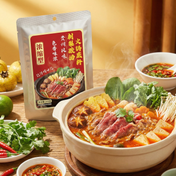 这张图片是产品主体这款产品是美芡·贵州刺梨酸汤火锅底料 我需要设计20张主图在拼多多上面售卖 这一袋的克重主要是105g 主图场景布局火锅元素 多增加一些贵州火锅底料细节图 还有火锅底料相关的元素 整体图片高级一些有食欲一些 主图文案内容家人吃的当然要选放心的 贵州酸汤 加水即煮 酸爽下饭 酸香浓郁 锁鲜留香 汤色鲜红 回味多层次的酸香 一锅煮万菜 真材实料吃着放心 匠心之作 味道正 食材严 工艺精 味道纯正 口感醇厚 色香味浓 浓缩型 滋补