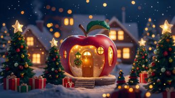 暖金背景下的圣诞树,融合3D与重拟物风格,点缀红苹果与光晕星饰,雪落粒子营造梦幻光影,礼盒堆叠传递喜庆温馨的节日氛围。