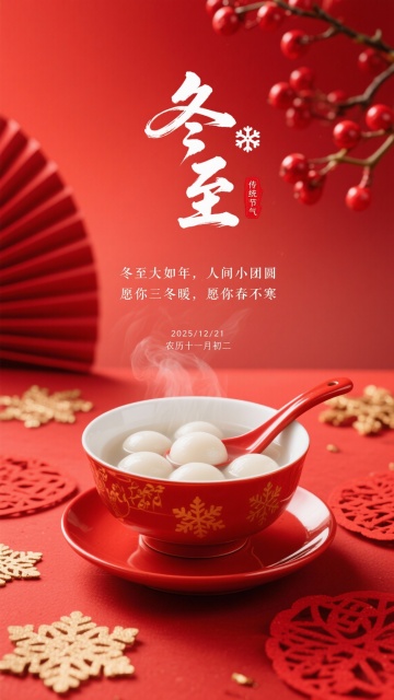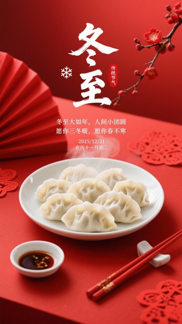 生成4张冬至海报,比例9:16。采用近景聚焦 + 喜庆国风的视角:画面主体是白瓷圆盘,盛着褶皱纹理清晰的白色饺子,冒着朦胧白汽,碗旁配同色红瓷筷子与小碟蘸料;背景元素:正红色渐变底色,左边红色桌面点缀展开的红色折扇,右上角延伸出一枝红色梅花,红色桌面散落着幅、红色剪纸花纹;文字布局:画面中上部是白色毛笔书法 “冬至”(笔触洒脱有力),旁侧嵌白色雪花图标与朱红 “传统节气” 印章;书法下方是白色文字 “冬至大如年,人间小团圆 愿你三冬暖,愿你春不寒”;底部标注 “2025/12/21 农历十一月初二”;整体风格:浓艳喜庆的国风写实风,色调以正红、金、白为主,光线是柔和的暖光(突出饺子的温润质感与白汽的朦胧氛围),细节需呈现:瓷碗的釉面光泽、饺子的肌理、白汽的缥缈层次、雪花装饰的镂空纹理,8K 分辨率,氛围是冬至的暖情团圆感,兼具传统节日的喜庆与温柔祈愿的质感。