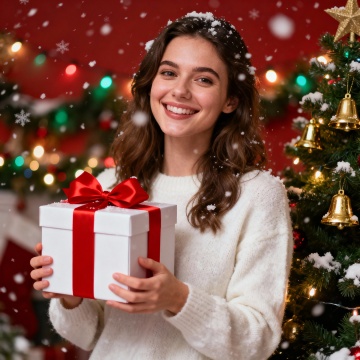 提取图中的毛绒玩具,请生成一幅圣诞节室内妈妈给孩子送礼物的场景图。小女孩5-6岁,高加索人种,有金色的长直发扎成两个马尾,明亮大眼睛,笑容灿烂。她身穿圣诞节毛衣,白色帆布鞋。整个画面充满了童真的欢乐,凸显出小女孩=的喜欢。