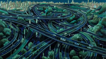 一条宽阔延伸的沥青道路,路面呈现出细腻的横向纹理和中间醒目的白色分隔线,道路尽头是现代化的城市天际线,高楼林立,远处有一片平静的水域,天空中飘着几朵白云,整体画面采用极简主义的插画风格,线条流畅,色彩以灰蓝色调为主,营造出宁静而开阔的氛围,具有强烈的设计感和空间感。