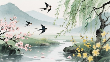 水墨风与国潮风交融,扁平化插画展现江南水乡静谧之美,柳影婆娑,白鹤掠空,清透柔和的色调营造出清新舒适的古典意境。