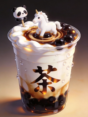 软3D风奶茶,萌趣熊猫与独角兽立于奶盖之上,梦幻液态光泽,重拟物细节,卡通感十足,节日氛围满满。