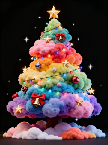 梦幻3D圣诞树,彩虹云朵质感,毛发生长风渲染,软萌膨胀造型,点缀星光与彩灯,营造可爱喜庆的虚拟自然节日氛围。