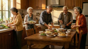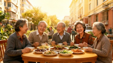 一对头发花白的老年夫妇在不同的户外场景中温馨互动的画面,背景可以是公园的林荫道、湖边的长椅、山间的小径或宁静的花园等。两位老人面带温暖灿烂的笑容,神情愉悦自然,老爷爷穿着浅灰色的长袖针织衫,老奶奶穿着米色的高领内搭和同色系的开衫马甲,老奶奶手中捧着一个白色的茶杯,老爷爷的手臂亲切地搭在老奶奶的肩上,两人姿态亲密和谐。画面整体采用写实风格,光线明亮柔和,以自然光为主,呈现出温暖的色调,绿色的植物背景郁郁葱葱,充满生机,营造出宁静、幸福、安逸的氛围,整体构图清晰,主体突出,细节丰富,具有生活气息和情感温度。