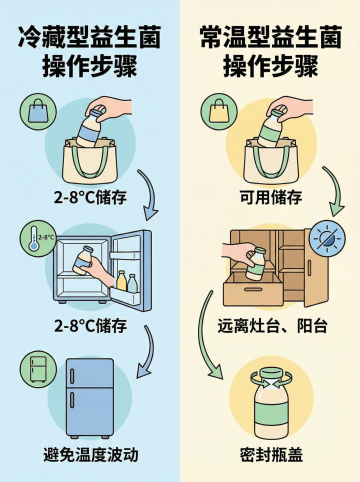 图片提示词:卡通风格,左侧为适宜储存环境(冰箱冷藏层,有“2-8℃”标识,益生菌瓶身完好密封,周围无高温、潮湿元素),右侧为不适宜环境(阳台阳光直射、厨房灶台旁、未密封的益生菌瓶,标注“高温、潮湿、光照”红色警示),配色清新,重点信息突出,适合公众号传播。