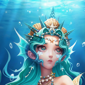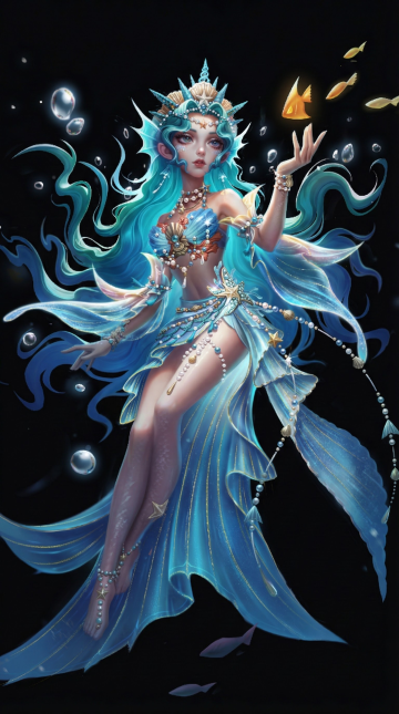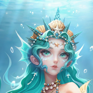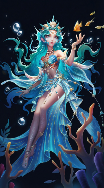 梦幻感与唯美感交织的插画风美人鱼,融合水彩与水墨技法,呈现清新柔和的海底世界,拟人化的海之精灵手持螺壳,宛如仙境。