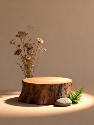 湿润的苔藓覆盖着起伏的地面,中央放置一块表面光滑的圆形青石,周围点缀着带有露珠的蕨类和小型绿色植物,背景是柔和渐变的浅绿色,整体呈现出清晨森林中宁静自然的氛围,光线柔和地洒在苔藓和植物上,营造出清新湿润的感觉。