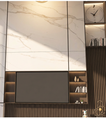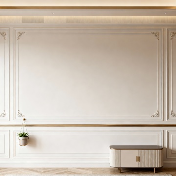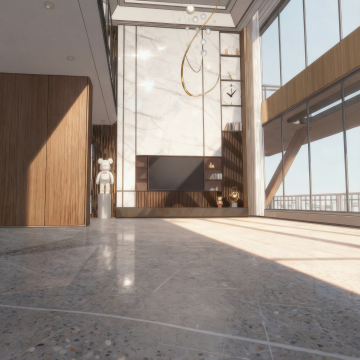 低角度仰拍,极简主义风格客厅3D渲染图,以哑光黑色、乳白色和烟熏橡木色为主色调,黄昏时分的戏剧化光线从右侧整面落地窗斜射而入,在地面投射出窗框的几何阴影,窗外是城市天际线与渐暗的粉紫色天空。天花板采用悬浮式设计,隐藏式LED灯带勾勒出层次分明的几何线条,地面铺设大块哑光黑色石砖,中央是一块带有微妙纹理的浅灰色羊绒地毯。L型模块化沙发采用深炭灰色科技布料,搭配三个不规则形状的芥末黄靠垫和一个圆形焦糖色皮质抱枕。沙发前是一个由哑光黑色金属框架支撑的白色大理石台面茶几,左侧是一个圆柱形烟熏橡木边几,右侧是一个低矮的梯形橡木储物脚凳。背景墙采用浅灰色艺术涂料,悬挂着一幅抽象几何金属壁挂艺术品,右侧墙面嵌入式展示柜内置暖色LED灯,陈列着极简风格陶瓷摆件和几株形态优雅的琴叶榕与龟背竹。整体空间呈现出冷静克制的高级感,光影交错间营造出既疏离又温暖的都市居住氛围。