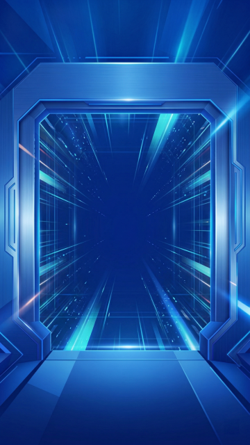 赛博朋克风与几何风交织,霓虹蓝光切割深邃夜空,粒子流与金属质感线条构建未来感空间,光影交错中尽显科技张力。