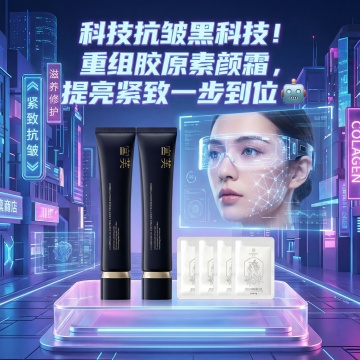 红金撞色促销风,紫白修护面膜与红金展台、促销标签结合,色彩鲜明,营造热烈吸睛的护肤促销氛围。