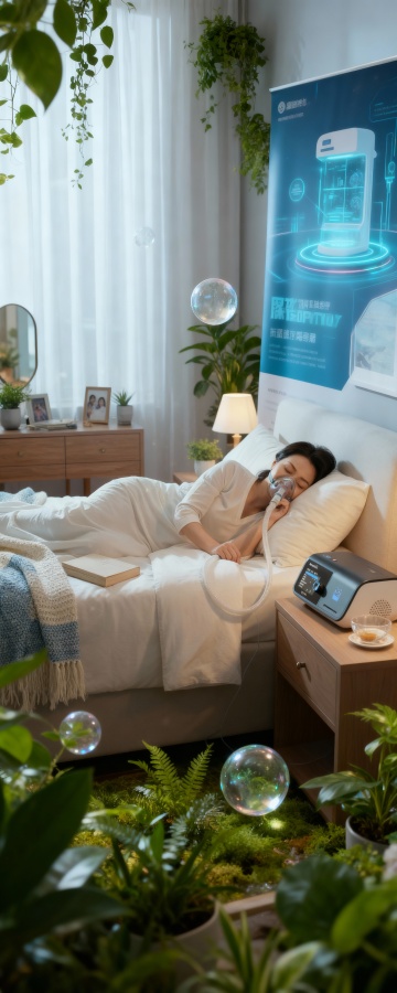 温馨的卧室场景,母亲躺在床上 戴上呼吸机面罩,夜色温柔地笼罩着房间,屋内光线柔和,空气中弥漫着淡淡的蜜糖水甜味,营造出宁静、温馨、充满爱意的氛围