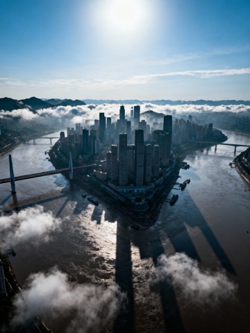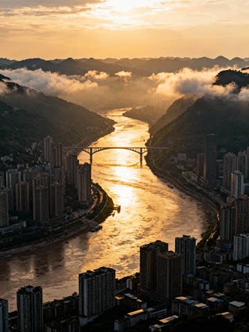 实景感中式古典建筑,city pop风光影交错,宽阔水面映衬浪漫夕阳,印象画派水彩风唯美景致。